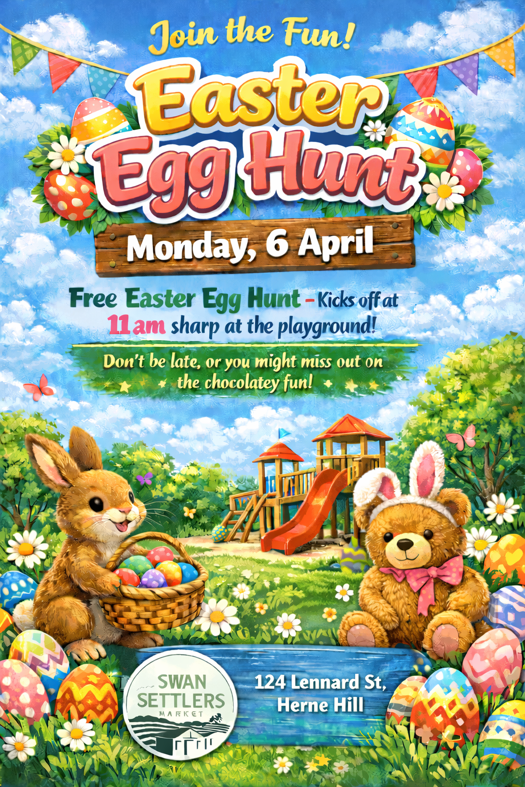 Arrive early — the egg hunt is popular and runs quickly.